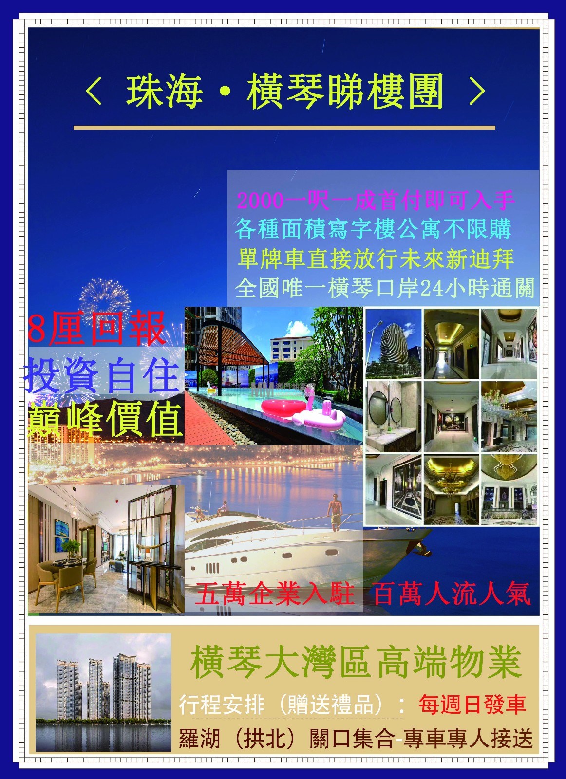 ●交通:2分鐘入橫琴,5分鐘上港珠澳大橋,10分鐘到橫琴關口過澳門,15分鐘到拱北關口,40分鐘直達香港,60分鐘廣珠西線到廣州深圳。